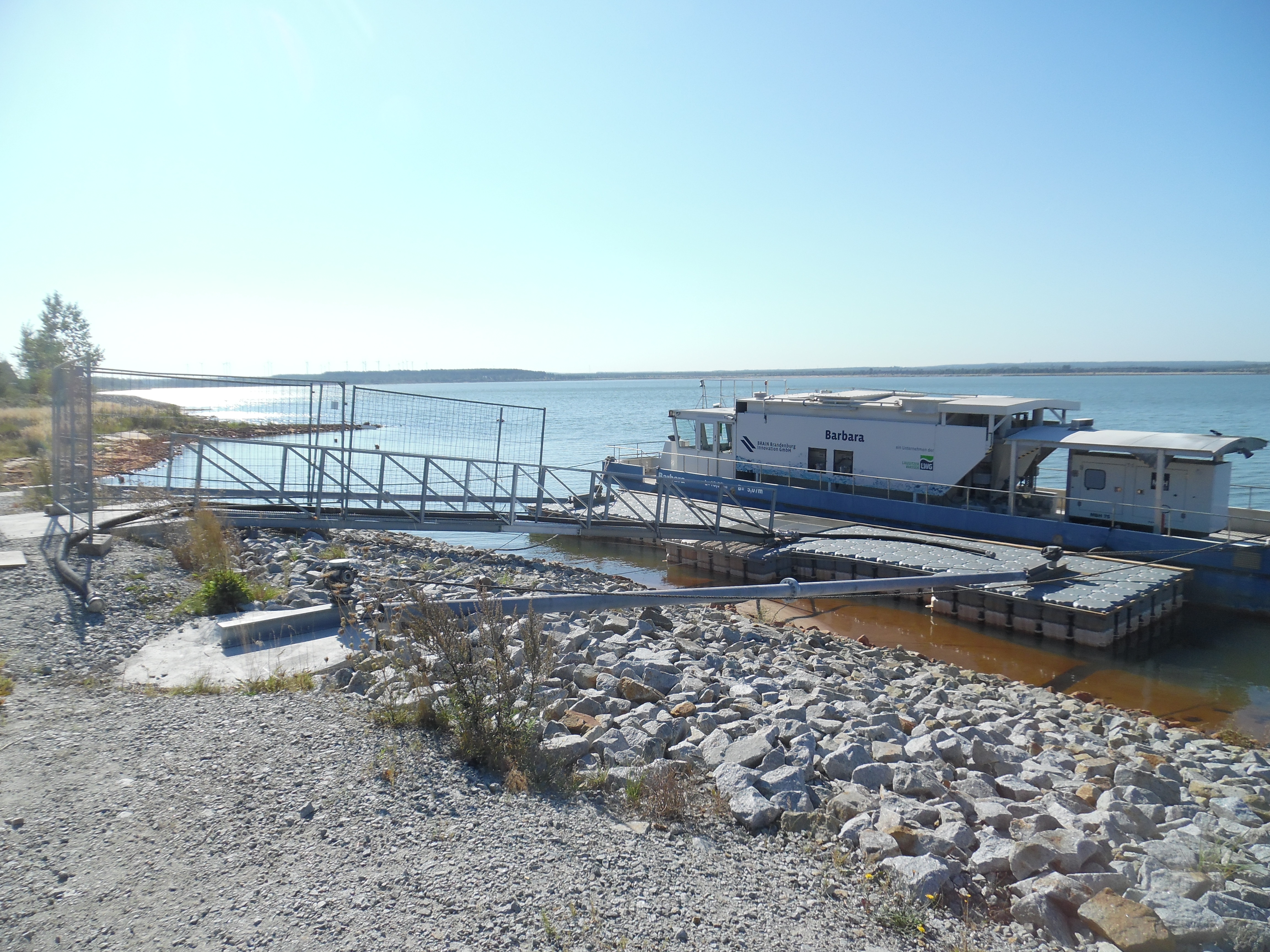 Für das Sanierungsschiff "Klara" wurde eine schwimmende Steganlage aus Kunststoffpontons errichtet. Das Sanierungsschiff "Klara" fährt auf verschiedenen Seen (im Lausitzer Seenland) um die Bekalkung der Tagebaufolgeseen durchzuführen. Dadurch kann der ph-Wert des Wassers nach und nach angehoben werden.
