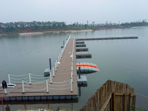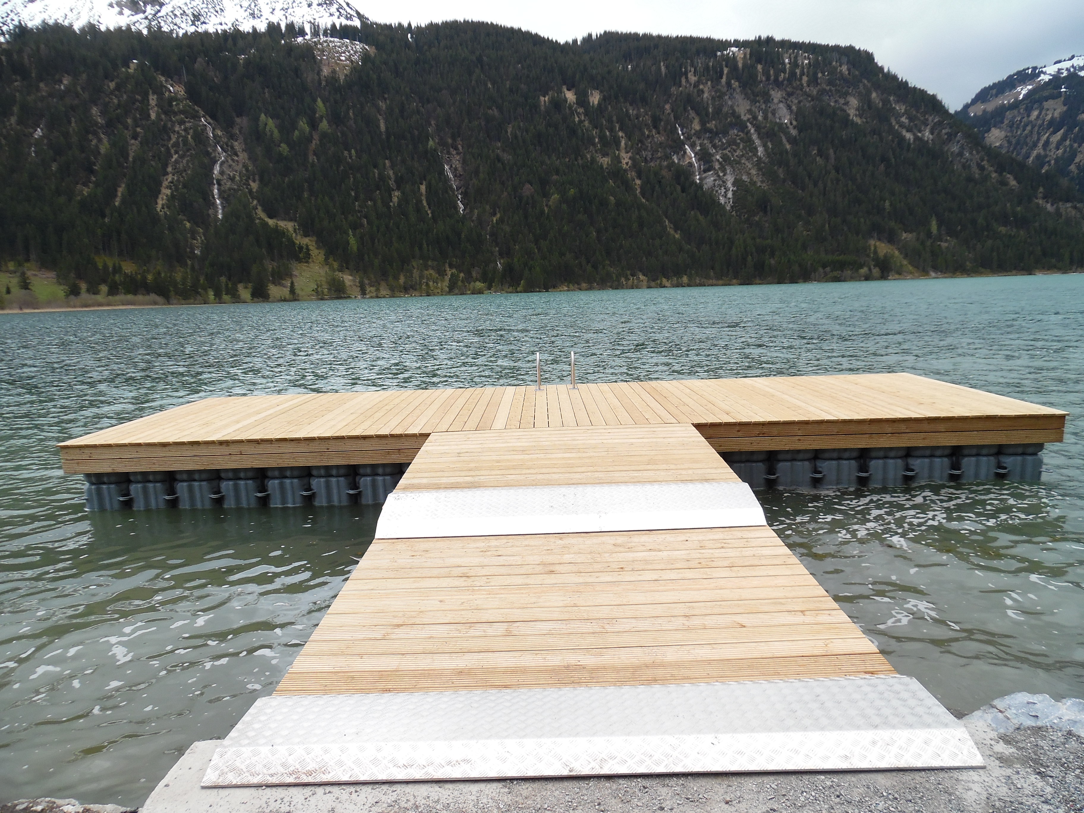 Schwimmende Pontonschwimmkörper für Steganlagen mit Holzbelag aus Kunststoffpontons